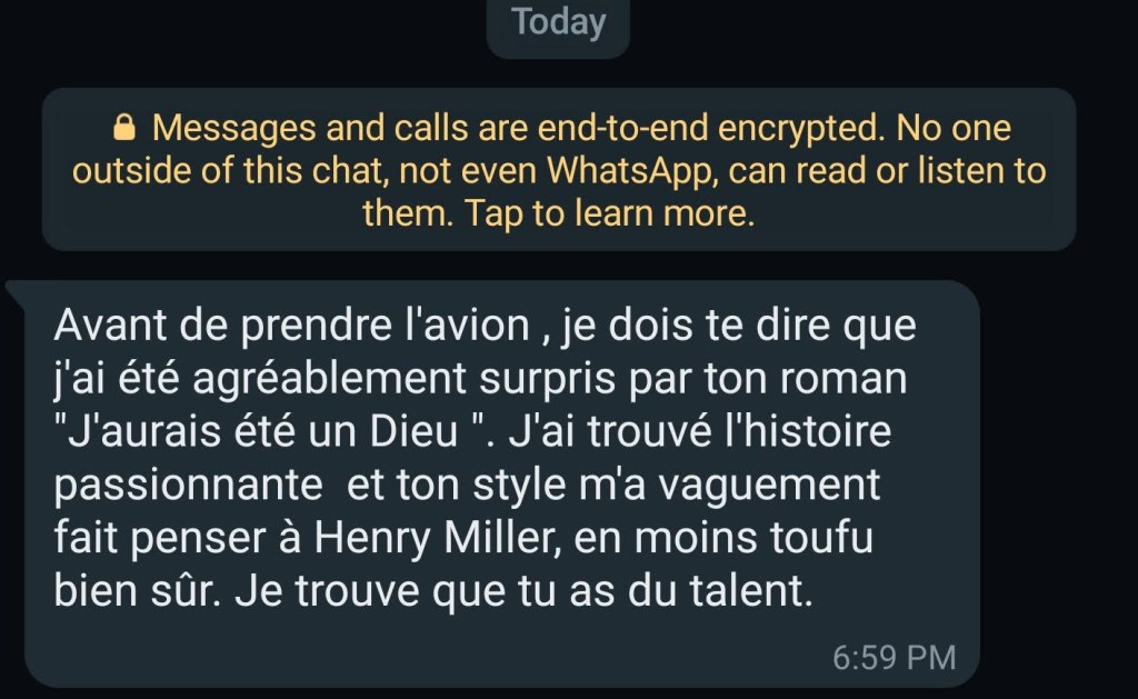 « J’ai fini ton livre dans l’avion. Passionnant! » Isabelle S.